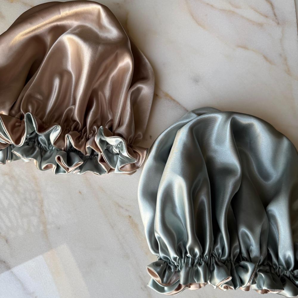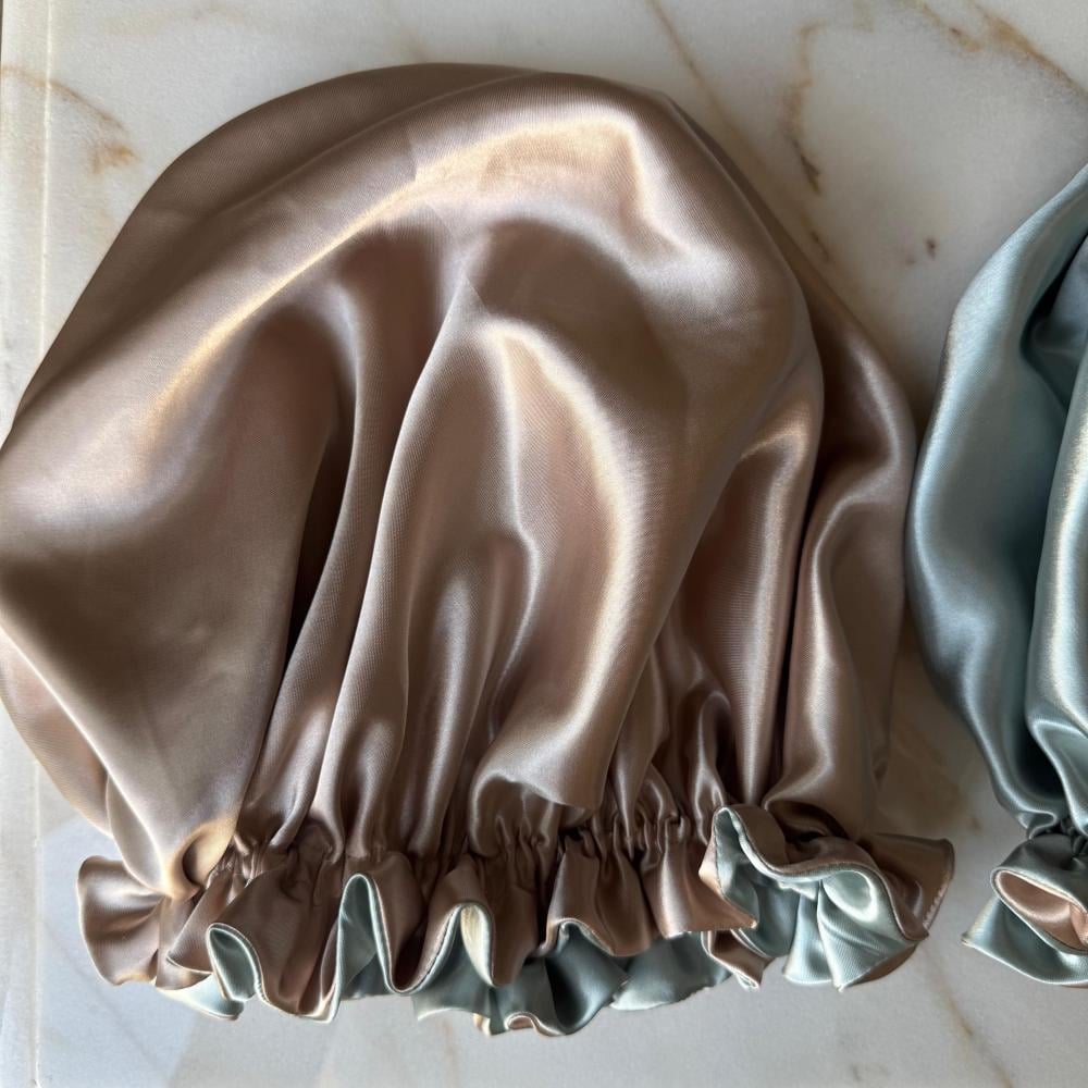 غطاء راس حرير ستان وجهين لون اخضر و وبيج